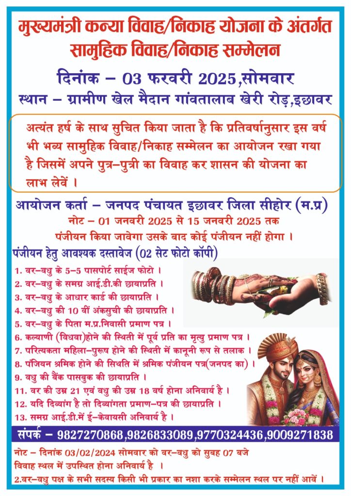 अत्यंत हर्ष के साथ सुचित किया जाता है कि प्रतिवर्षानुसार इस वर्ष भी भव्य सामुहिक विवाह/निकाह सम्मेलन का आयोजन रखा गया है जिसमें अपने पुत्र-पुत्री का विवाह कर शासन की योजना का लाभ लेवें ।