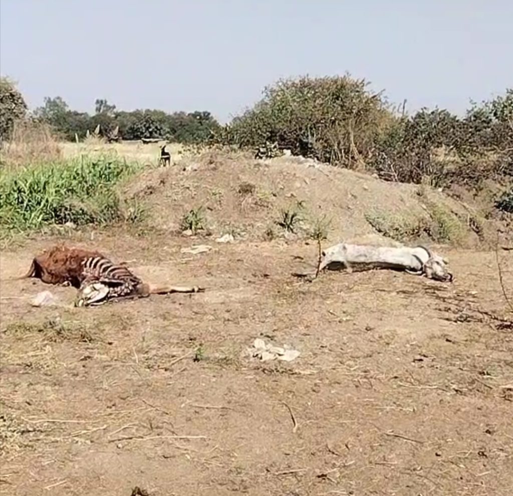 ग्राम पंचायत भाऊखेड़ी में गौ माता का हाल बेहाल, गौ शाला में गौ माता के मृत होने के बाद की स्थिति दयनीय, शव को नही गाड़ा जाता जमीन में आधा दर्जन शव खुले में जमीन पर पड़े मिले।
