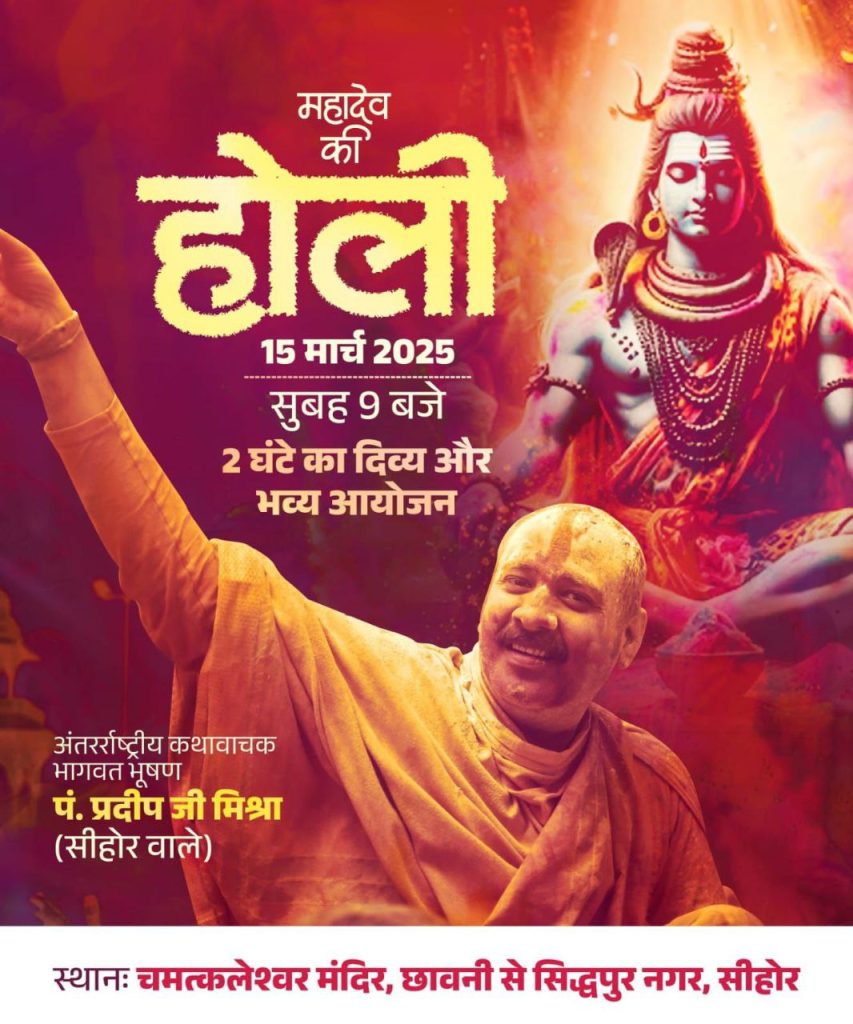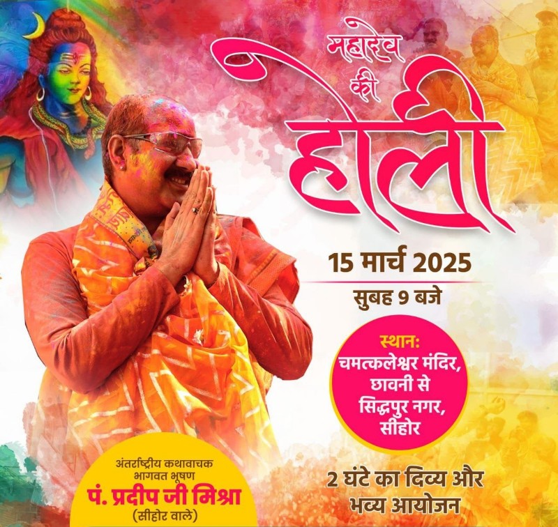 सीहोर। महादेव की होली इस वर्ष 15 मार्च शनिवार को मनाई जायेगी। जिसको लेकर सीहोर नगर में जोरदार तैयारियॉ चल रही हैं। धरतीपुत्र पंडित प्रदीप जी मिश्रा के सानिध्य में महादेव की होली पर एक विशाल चल समारोह नगर के प्रमुख मार्गों से निकलेगा। जिसमें बड़ी संख्या में सीहोर सहित देशभर के भक्त और हुरियारे सम्मिलित रहेंगे।