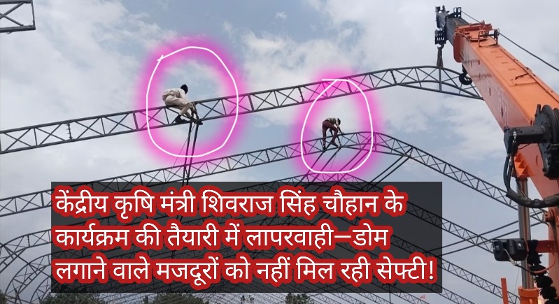 “जहाँ एक ओर सरकार मज़दूरों की सुरक्षा को सर्वोच्च प्राथमिकता देने की बात करती है, वहीं दूसरी ओर केंद्रीय मंत्री शिवराज सिंह चौहान के कार्यक्रम में एक बड़ी लापरवाही सामने आई है। कार्यक्रम स्थल पर डोम लगाने के काम में जुटा एक मजदूर वर्ग बिना किसी सेफ्टी उपकरण के ऊंचाई पर काम करता नजर आया।”