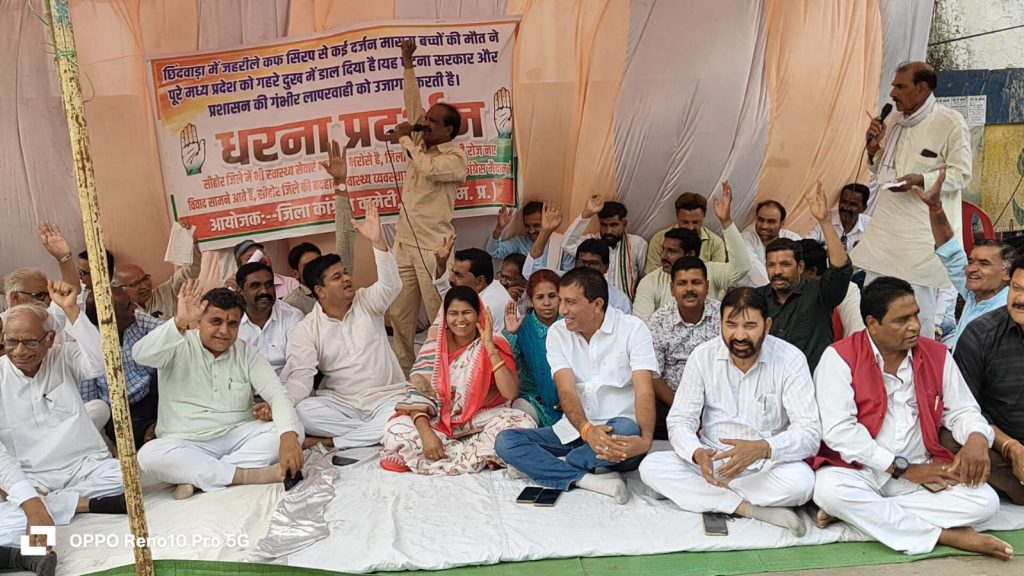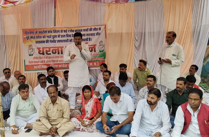वर्तमान सरकार की नाकामी के कारण बच्चों की मृत्यु सर्दी जुकाम का इलाज करने में कफ सिरप से हो जाती है और असंवेदनशील सरकार और उसके मुख्यमंत्री पत्रकारों से कहते हैं कि कल की बात छोड़ों आज की बात करों ना स्वास्थ्य मंत्री का कोई इस्तीफा सामने आया ना किसी नैतिकता के आधार पर किसी अधिकारी पर आज तक कोई कार्रवाई हुई। उन्होंने मध्य प्रदेश के निवासियों को नहीं पूरे देश के निवासियों को झंझोर कर रख दिया। स्वास्थ्य व्यवस्थाओं की स्थिति यह है कि एक झोला छाप डॉक्टर के गलत इंजेक्शन से एक मासूम बच्ची की मृत्यु हो गई। वहीं रोज नए विवाद जिला अस्पताल में सामने आते हैं डॉक्टर है नहीं तृतीय, चतुर्थ श्रेणी कर्मचारी डॉक्टरों का काम कर रहे हैं, इन्होंने स्वास्थ्य व्यवस्थाओं की स्थिति को जमीन पर ला दिया है। गांव-गांव, गली-गली, मोहल्ले-मोहल्ले में अस्पताल खुल गए कोई देखने वाला नहीं है, जिस अस्पताल पर स्वास्थ्य विभाग कार्यवाही करता है, उस अस्पताल को 15 दिन बाद उसे अस्पताल को नए नाम से सीएमएचओ कार्यालय परमिशन दे देता है। भेरुंदा के नर्मदा अस्पताल में एक मृत व्यक्ति के शरीर को पैसे के अभाव में मृत शरीर उसके पीडि़त परिवार को नही दे रहे थे। पूर्व विधायक शैलेन्द्र पटेल ने कहा कि जिस तरह से छिंदवाड़ा में मासूमों की हत्या हुई है, उसमें उन मासूम बच्चों की क्या गलती थी, यह सीधे-सीधे सरकार की लापरवाही थी। सिर्फ डॉक्टर को निलम्बित करने से क्या हो जायेगा, स्वास्थ्य मंत्री को इस्तिफा देना चाहिये, क्योंकि यह उनकी उम्मेदारी है। जिला चिकित्सालय और स्वास्थ्य विभाग पंगु बना हुआ है, स्वास्थ्य अधिकारी नेताओं की जी हजुरी में लगे हुए हैं। अगर स्वास्थ्य अधिकारी नेताओं के कदमों में पड़े रहेगें तो सुचारू स्वास्थ्य व्यवस्था क्या कर पायेगें। धरना प्रदर्शन में अन्य कार्यकर्ताओं द्वारा भी अपने-अपने व्यक्तव्य कहे गये, जिनमें प्रमुख रूप से हरपाल ठाकुर, कमल सिंह चौहान, विवेक राठौर, गुलाब बाई ठाकुर, ओम वर्मा, नईम नवाब, राजाराम बड़े भाई आदि ने भी सभा को सम्बोधित किया। कार्यक्रम का संचालन सुनील दुबे ने किया। धरना प्रदर्शन में उपस्थितजनों में प्रमुख रूप से जिलाध्यक्ष राजीव गुजराती, पूर्व विधायक शैलेन्द्र पटेल, ओम वर्मा, नईम नवाब, हरपाल ठाकुर, कमल सिंह चौहान, जफर लाला, विवेक राठौर, गुलाब बाई प्रीतम दयाल चौरसिया, रमेश गुप्ता, सुनील दुबे, ओम बाबा राठौर, राजेश भूरा यादव, रामप्रकाश चौधरी, नरेन्द्र खंगराले, हर्षदीप राठौर, घनश्याम यादव, मुकेश ठाकुर,, मजीद अंसारी, इरफान लाला, प्रेम नारायण परमार, घनश्याम मीणा, राकेश वर्मा, अफीज चौधरी, सईद लाला मंसूरी, संतोष पटेल, बनेसिंह पटेल, तेज सिंह जावरिया, कृपाल मालवीय, मुकेश बड़ोदिया, मनोज पटेल, मुकेश ठाकु