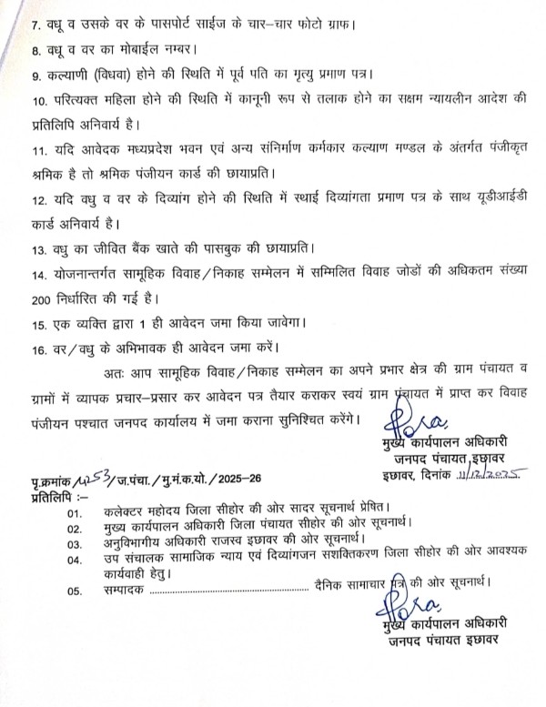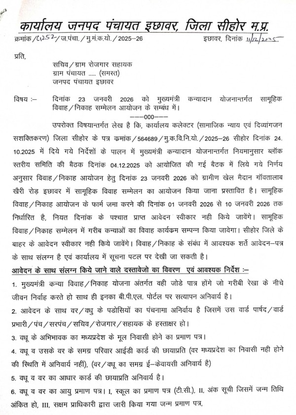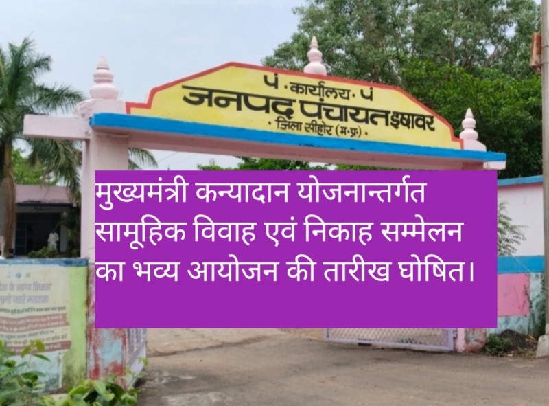 इछावर।मुख्यमंत्री कन्यादान योजनान्तर्गत सामूहिक विवाह एवं निकाह सम्मेलन का भव्य आयोजन की तारीख घोषित की गई है।23 जनवरी 2026 को होगा आयोजन।