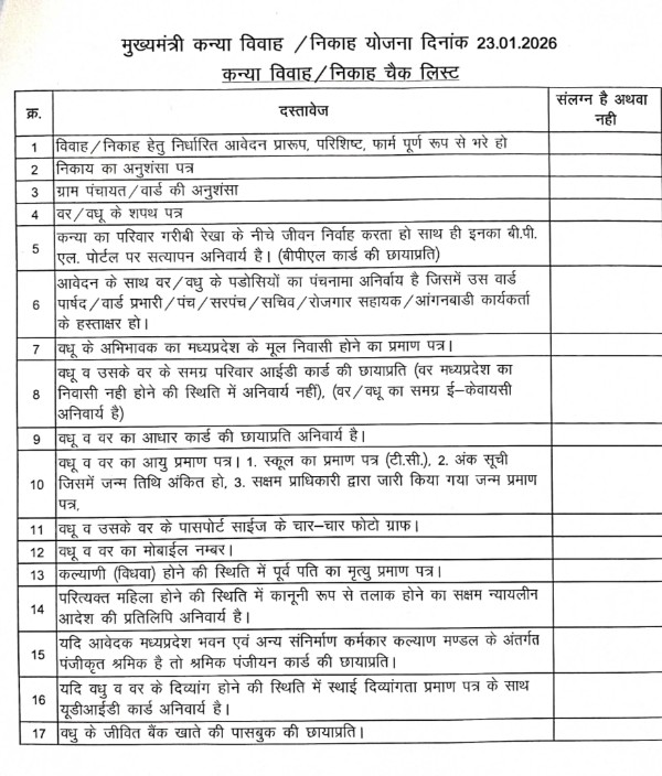 - वधू के अभिभावक का मध्यप्रदेश के मूल निवासी होने का प्रमाण पत्र।