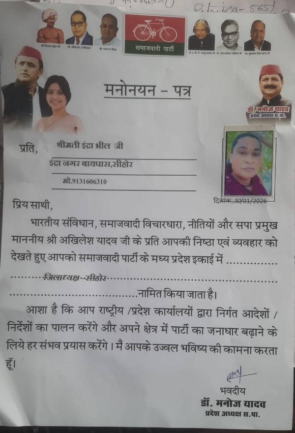 सीहोर। भारतीय संविधान, समाजवादी विचारधारा, नितियों और सपा प्रमुख अखिलेश यादव के प्रति निष्ठा एवं व्यवहार को दृष्टिगत रखते हुए प्रदेश अध्यक्ष डॉ. मनोज यादव द्वारा श्रीमती इंदिरा भील को पुन: समाजवादी पार्टी का सीहोर जिलाध्यक्ष मनोनित किया गया है।